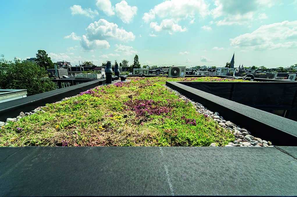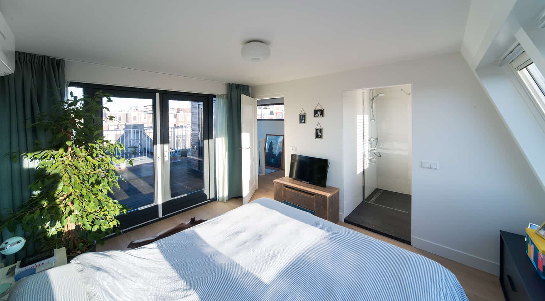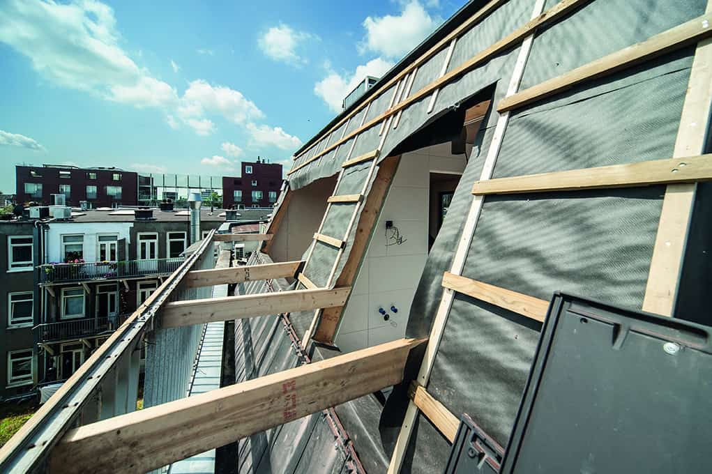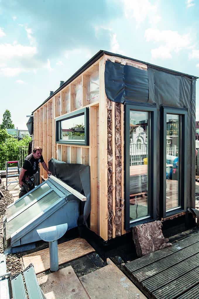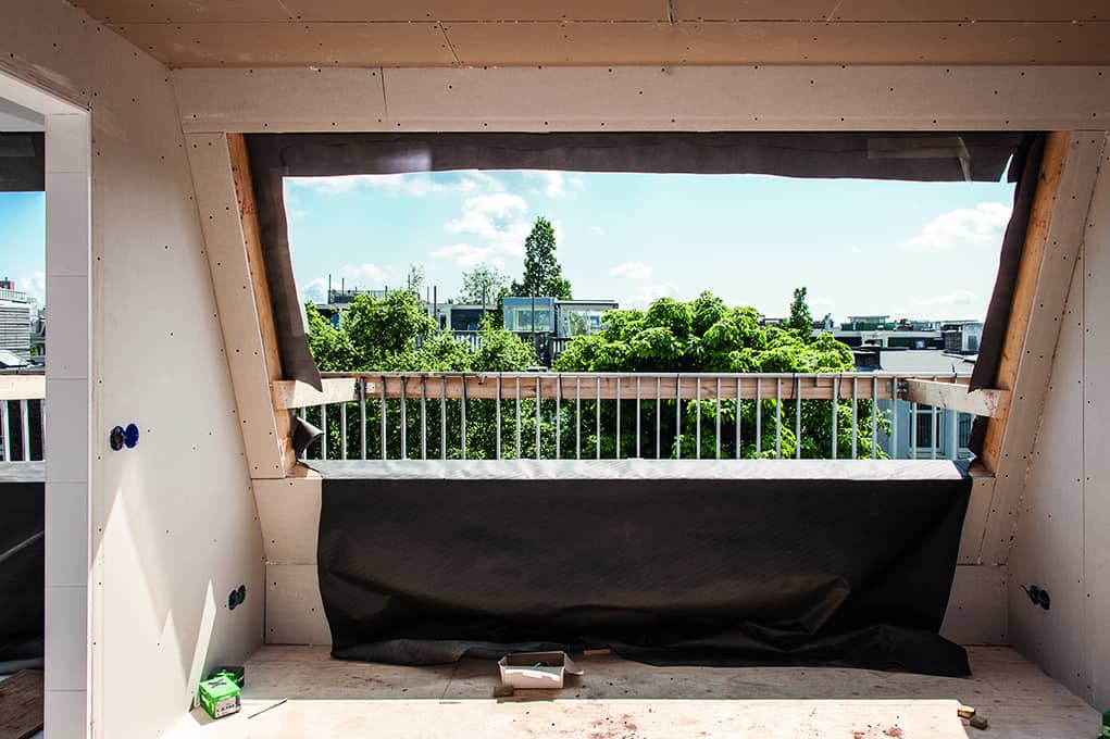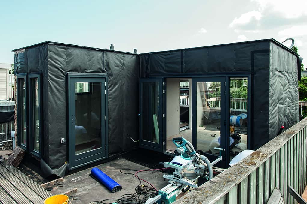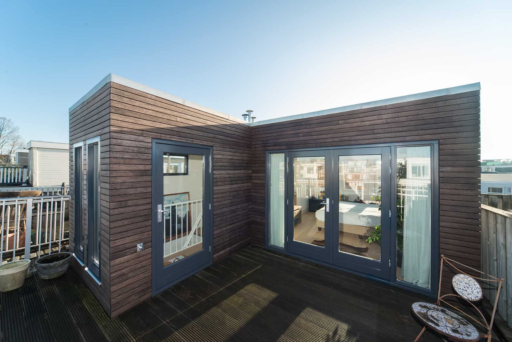 De dakopbouw is voorzien van een slaap- en badkamer en toilet. Het platte dak is omgetoverd tot een mos sedum daktuin. De gevel is bekleed met bamboe, waarbij het type Varibo 65mm is gebruikt.
