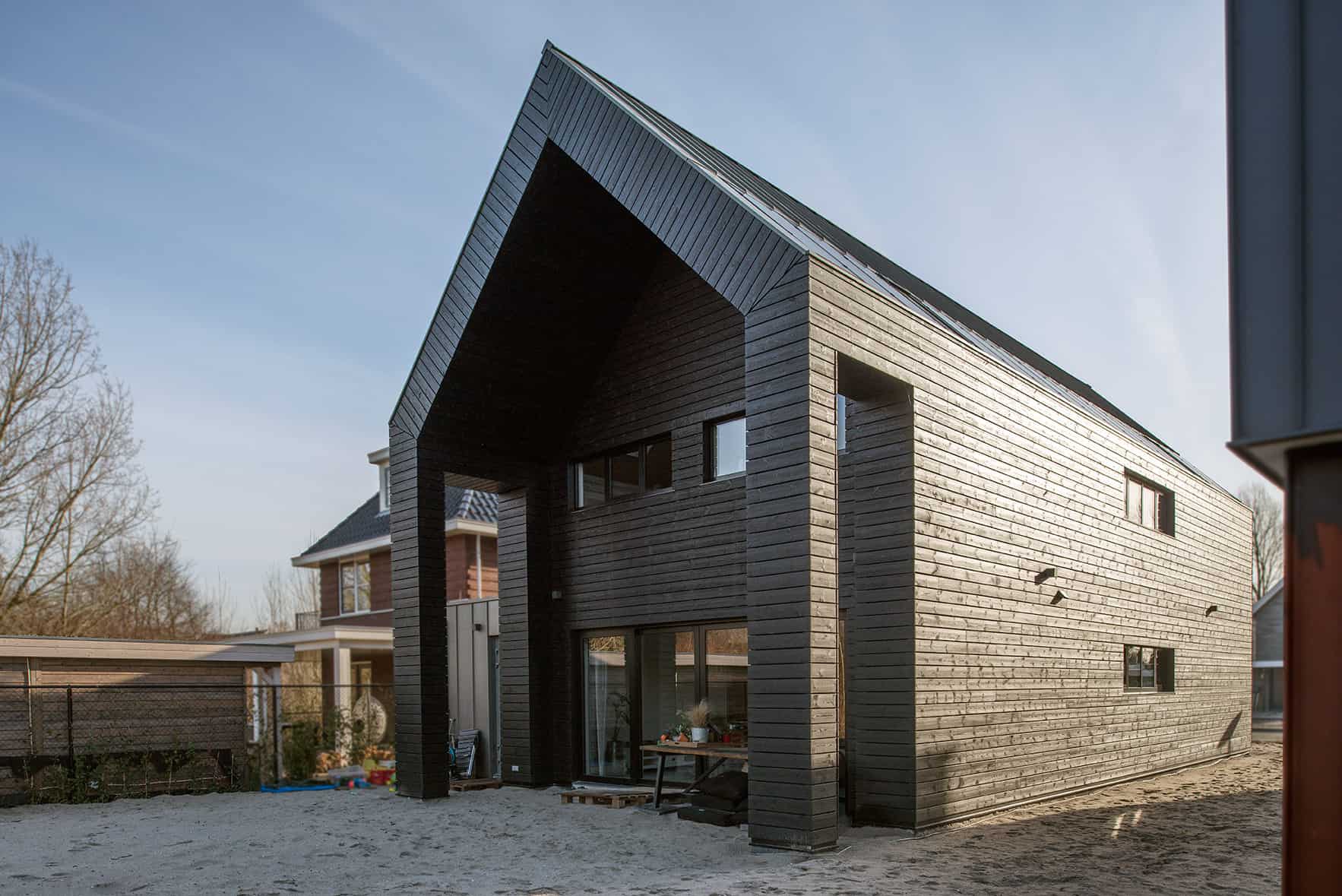 In de basis is het een schuurwoning, maar dan in volledig eigentijdse uitvoering: dat is de vrijstaande woning die wij bouwden in de nieuwe groene woonwijk van Almere: de Noorderplassen. Een groot deel van de wijk bestaat uit kavels die door bewoners zelf zijn bebouwd, waardoor het beeld speels en afwisselend en van deze tijd is.